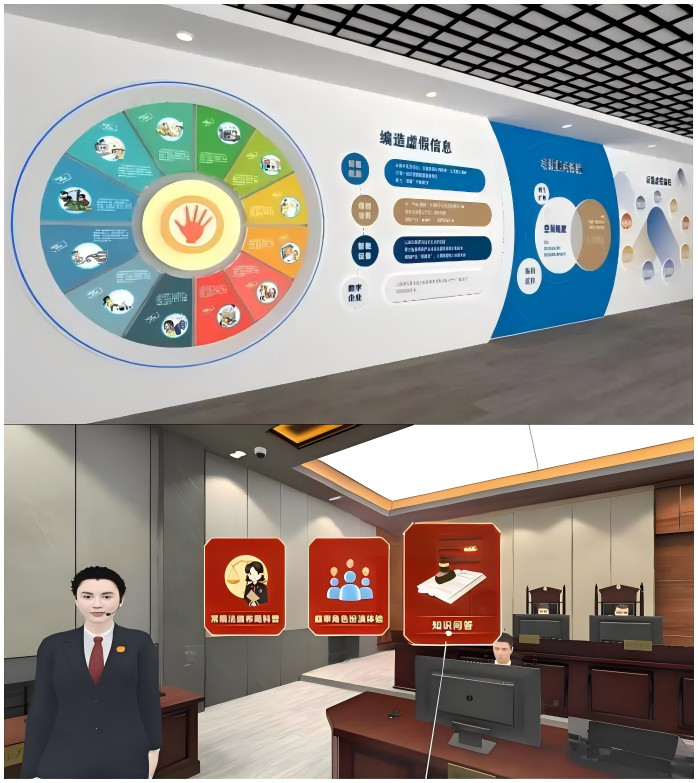 法治大轉盤:集聲光電技術于一體,觸碰手掌感應設備,燈箱轉動,展示特定法治案例及審判結果。 法治互動小游戲:開發多款法治主題小游戲,如 “法治大富翁”“法律知識連連看” 等,將法治知識融入游戲關卡中,青少年在輕松娛樂的氛圍中學習法治知識。 法治互動留言墻:采用電子屏搭建留言墻,青少年可手寫或輸入法治名言、學習感悟,內容實時顯示在屏幕上,還可對他人的留言進行點贊、評論,營造良好的法治學習交流氛圍。 VR 少年法庭體驗艙:真實案件改編劇本,支持角色扮演模擬審判,讓體驗者感受法庭審判流程。 校園安全情景模擬系統:模擬校園內可能遇到的各種安全風險場景,培養風險識別和應對能力。