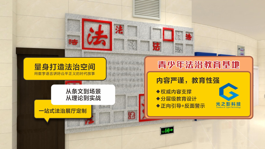 校園青少年法治教育基地建設:科技賦能法治教育新體驗校園青少年法治教育基地建設:科技賦能法治教育新體驗青少年是國家的未來和民族的希望,加強青少年法治教育,是推進依法治國、建設社會主義法治國家的基礎工程。傳統的法治教育多以課堂講授、發放手冊等形式為主,內容枯燥、形式單一,難以激發青少年的學習興趣和參與熱情,教育效果大打折扣。在此背景下,校園青少年法治教育基地建設應運而生,而光之影科技憑借其在數字展廳領域的深厚積淀,以 “科技賦能” 為核心,為基地打造出集知識性、趣味性、互動性于一體的法治教育新場景,徹底改變了青少年法治教育的固有模式 。